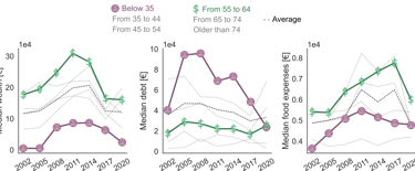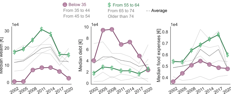 Data visualization of the generational imbalance that, throughout the years, takes place in Spain. Youngsters, as a group, have a higher median debt, lower median wealth and can spend less in food...