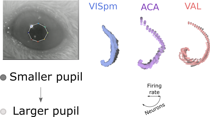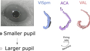 For this project, I had to plot over 30 arrays with different colors and shades, so I decided to go for a variation of a radial barplot. Per brain area, each shade indicates a different pupil size and the distance from the center is the firing rate of a neuron.