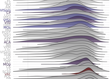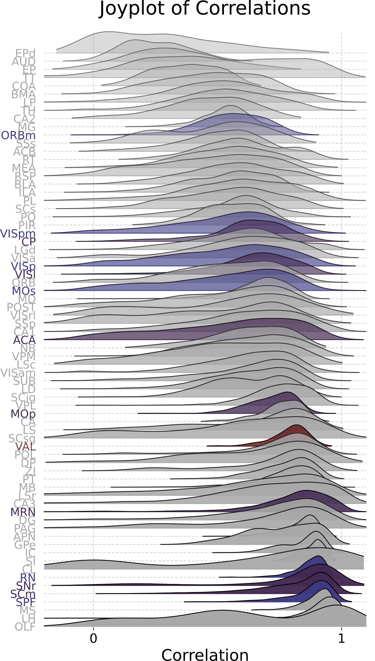 For this project, given the large amount of data that I had to visualize, I decided to go for a joyplot, sorting each density plot (i.e., brain region) by its mode.