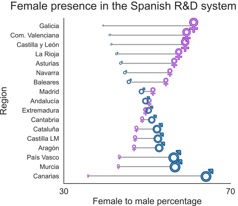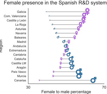 Project to show how well the Spanish R&D sector incorporates female and male workers. The hourglass-like shape shows the enormous regional differences.