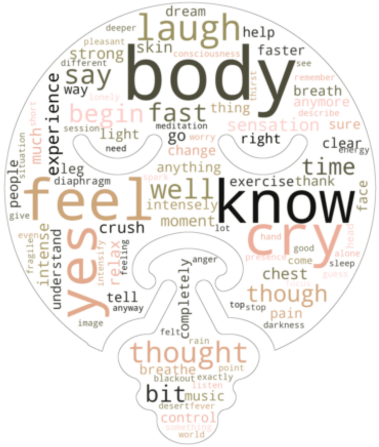 This Word Cloud layout shows the top most 100 common words in a pool of oral reports from subjects that had undergone a breathwork intervention. For fun, I masked the traditional rectangular layout to follow a breathing face!